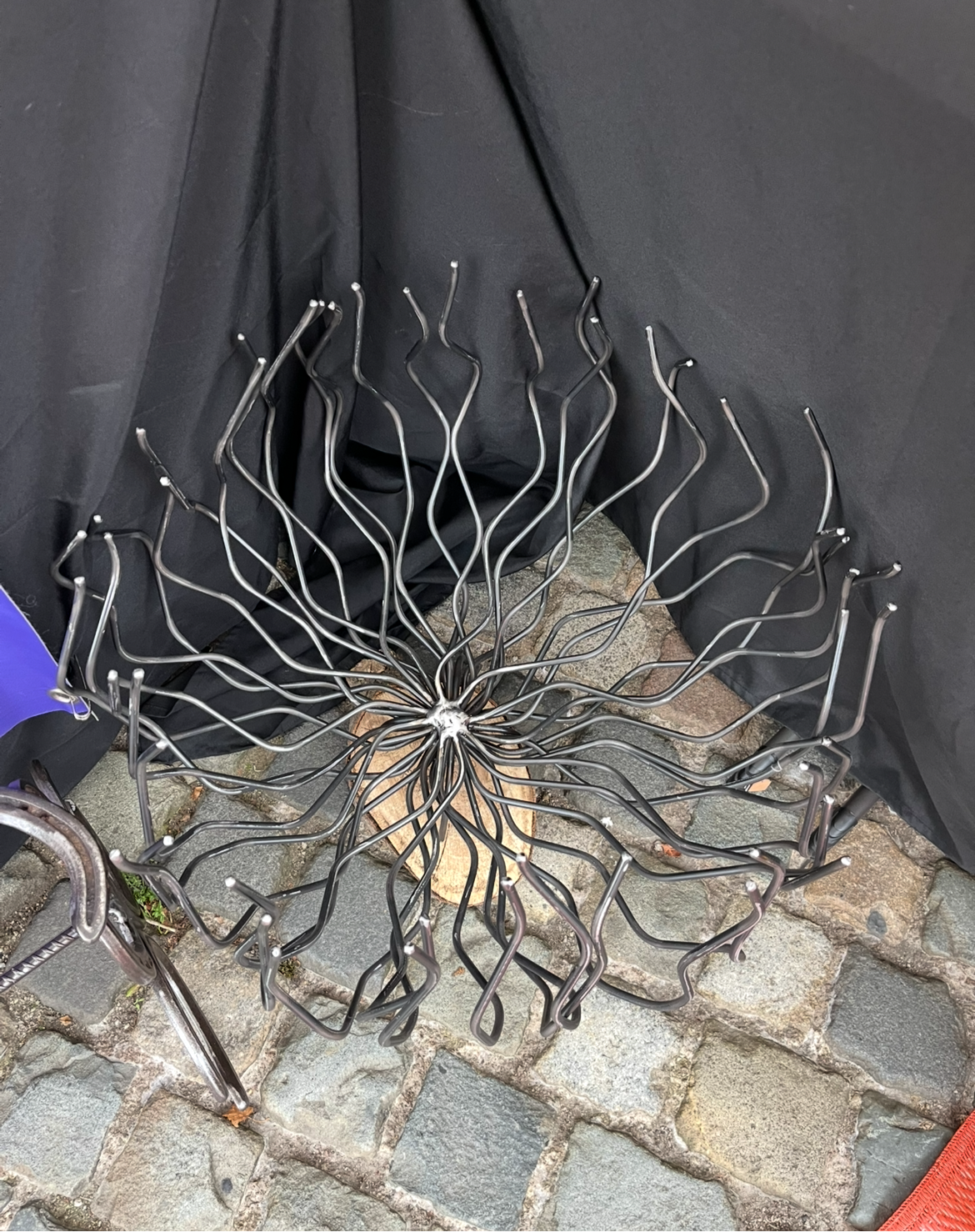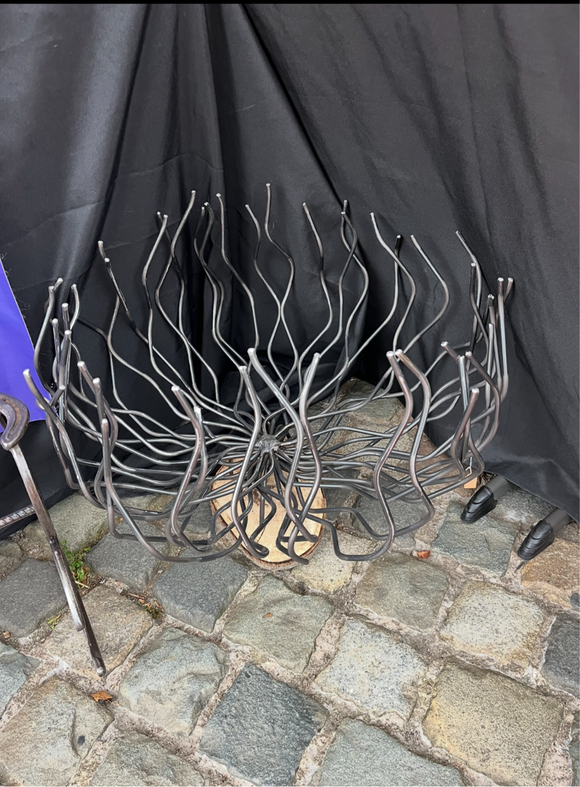 Unique log basket made out of 6mm mild steel round bar. Approximately 50cm diameter each basket is hand made and unique. Finished with a clear lacquer spray.